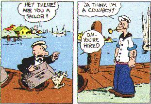 Prior to Comicbook heroes we had pulp heroes. "Pulps" were small 10 cent books sold on the newsstands, usually filled with action heroes going to exotic places and having adventures. Among these heroes were Doc Samson and The Shadow. They also had very popular radio shows. While they certainly did things that were beyond what a normal person could do, they weren't called superheroes or marketed as if they had abilities beyond a person at their physical peak. Nonetheless, they had their influence on what was to come. Another pre-Superhero came from the comic strips, he is Popeye. He was created by Elzie Segar and first appeared in a strip called Thimble Theater in 1929. While he didn't go out and fight crime, he did eat his spinich and displayed some 'above average' feats of human strength while fighting his nemises Bluto. This picture is the first ever appearance of Popeye.